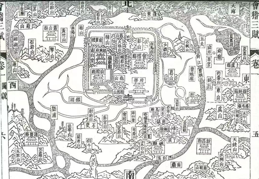 从宋·王十朋《会稽三赋》图中也可得到舜禹文化遗存分布的历史发展证据。其中:舜迹有上虞县、余姚县、百官、舜井、舜庙、舜江、姚丘、虞山、历山等,多在今曹娥江以东的绍兴东南部区域;禹迹有会稽山、宛委山、阳明洞、禹庙、涂山、窆石、了溪、夏盖山、夏盖湖等,多在绍兴城区及周边(曹娥江以西区域)。可谓越地第一张“舜禹遗迹图”。